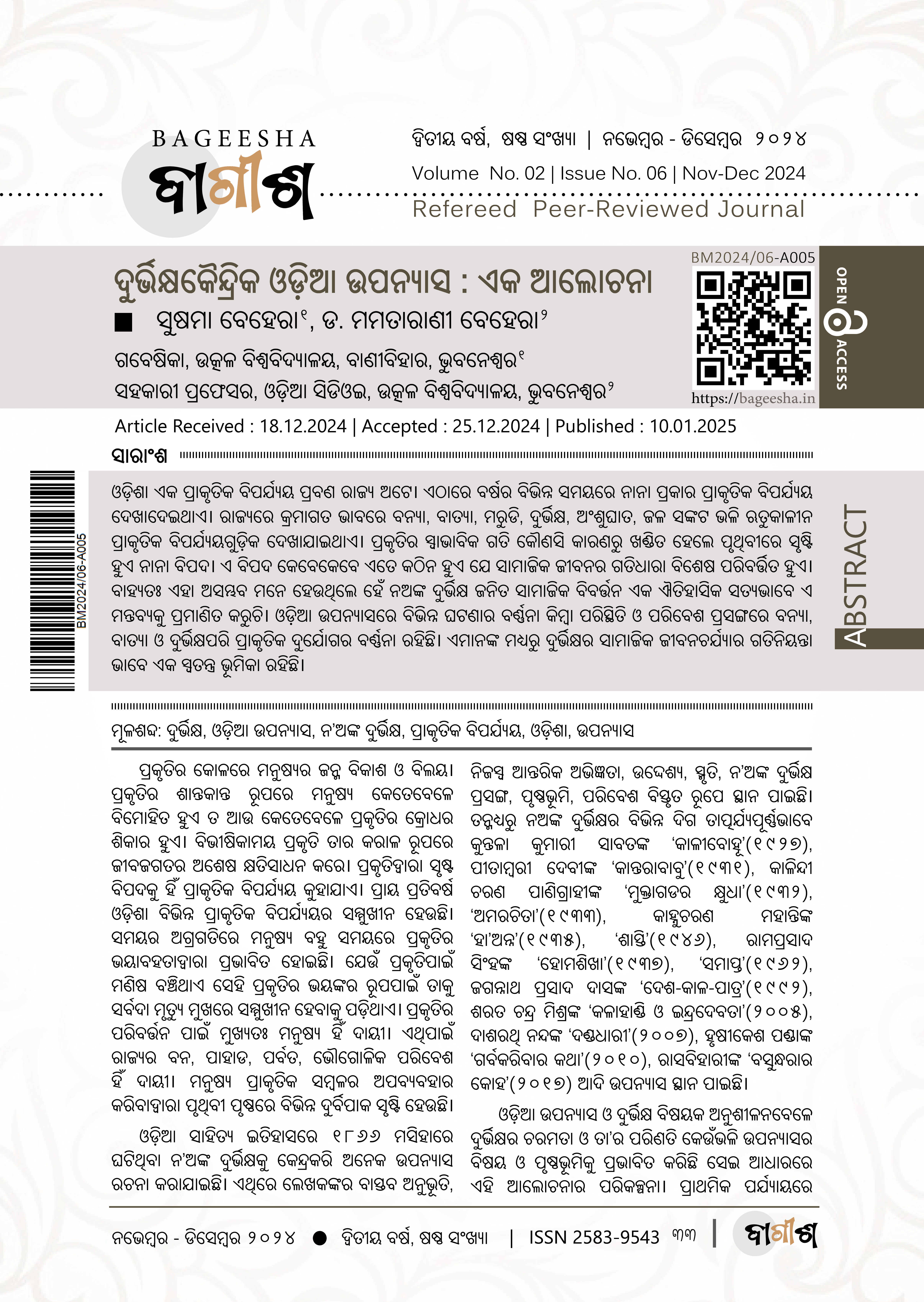 Sushama Behera, Dr. Mamatarani Behera, Durbhikshakaindrika Odia Upanyasa : Eka Alochana, Bageesha, Vol. No. 02, Issue No. 06, November- December 2024, Article No: BM2024/06-A005 | Page- 33-38