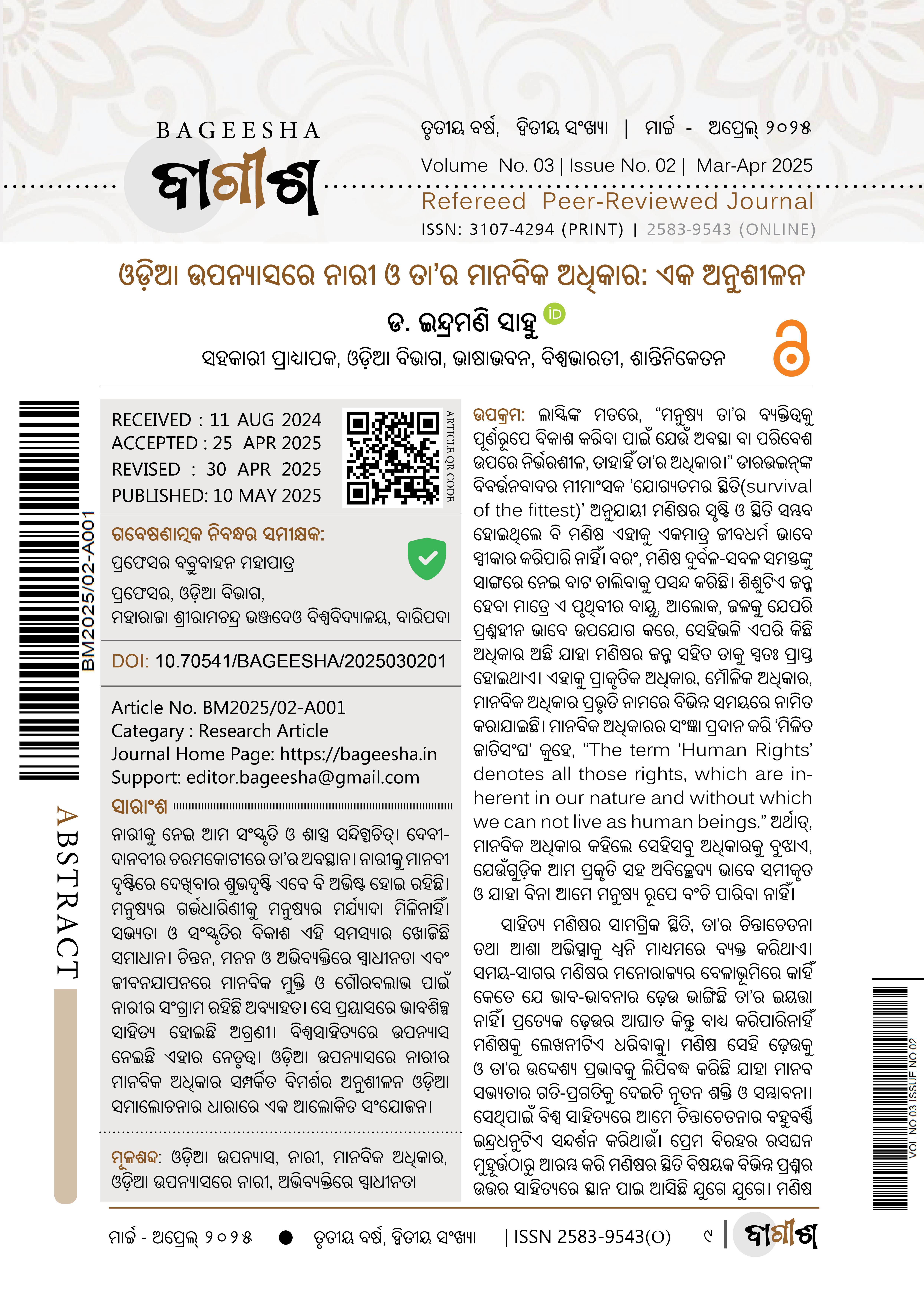 Sahu, Indramani, Odia Upanyasare Nari O Ta’ra Manabika Adhikara: Eka Anusilana, Bageesha, Vol. No. 03, Issue No. 02, March – April 2025, Article No: BM2025/02-A001| Page- 09-17| DOI: https://doi.org/10.70541/BAGEESHA/2025030201