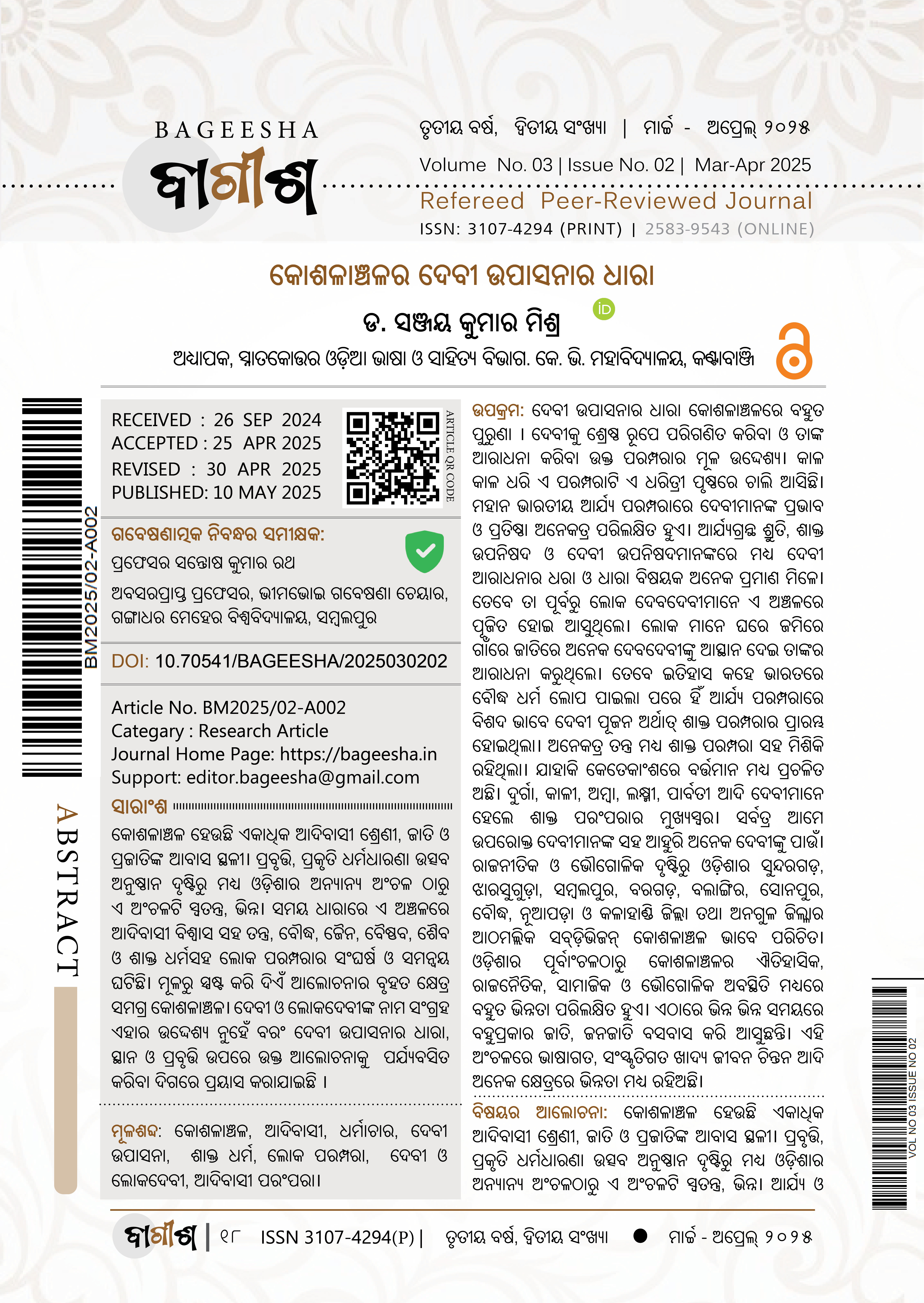 Mishra, Sanjaya Kumara, Koshalanchalara Debi Upaasanara Dhara, Bageesha, Vol. No. 03, Issue No. 02, March – April 2025, Article No: BM2025/02-A002| Page- 18-21| DOI: https://doi.org/10.70541/BAGEESHA/2025030202