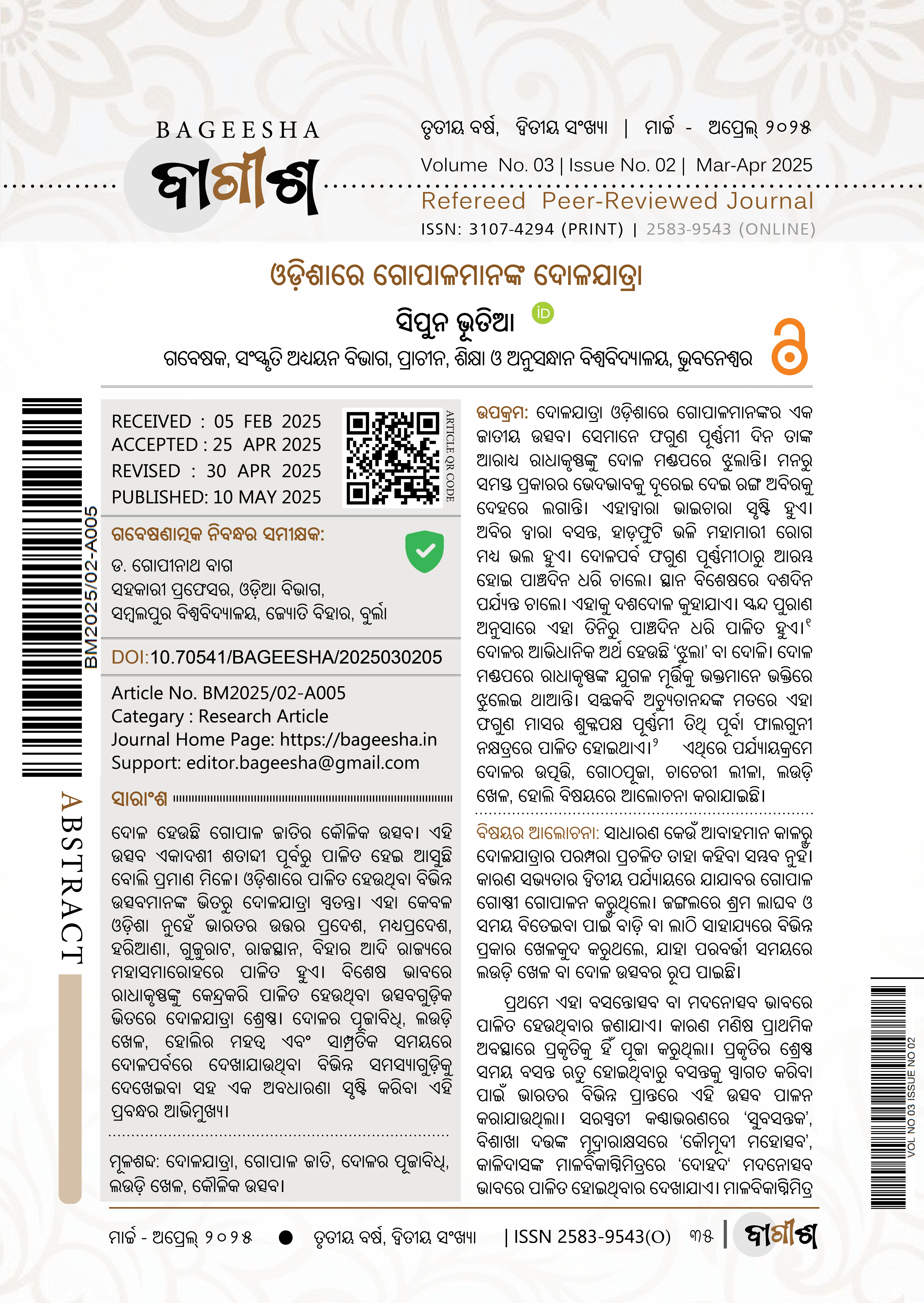 Bhutia, Sipun, Odishare Gopalamananka Dolajatra, Bageesha, Vol. No. 03, Issue No. 02, March – April 2025, Article No: BM2025/02-A004| Page- 35-39| DOI: https://doi.org/10.70541/BAGEESHA/2025030205