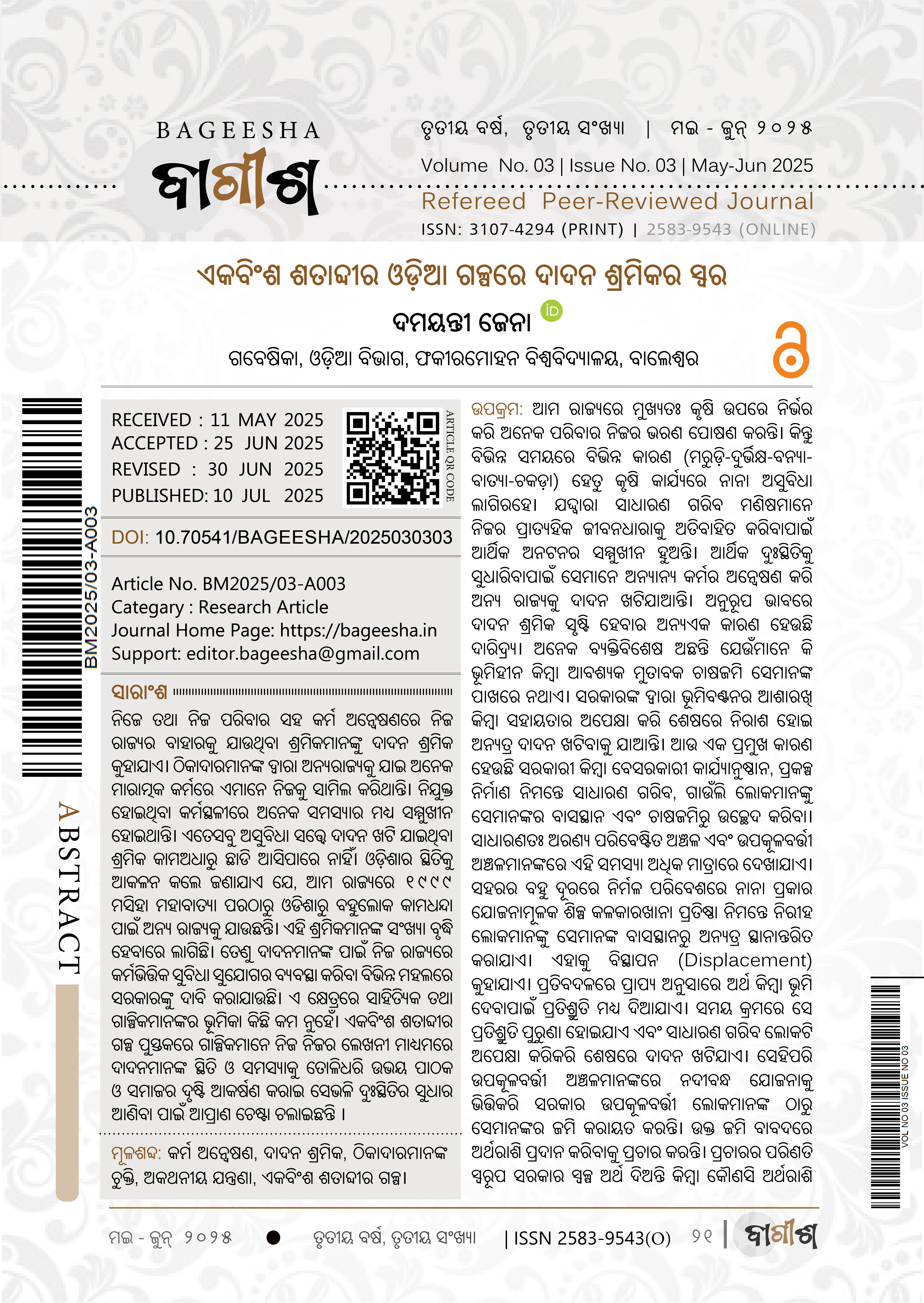 Jena, Damayanti, “Ekabinsha Satadira Odia Galpare Dadana Sramikara Swara”, Bageesha, Vol. No. 03, Issue No. 03, May-June 2025, Article No: BM2025/03-A003| Page- 21-25| DOI: https://doi.org/10.70541/BAGEESHA/2025030303