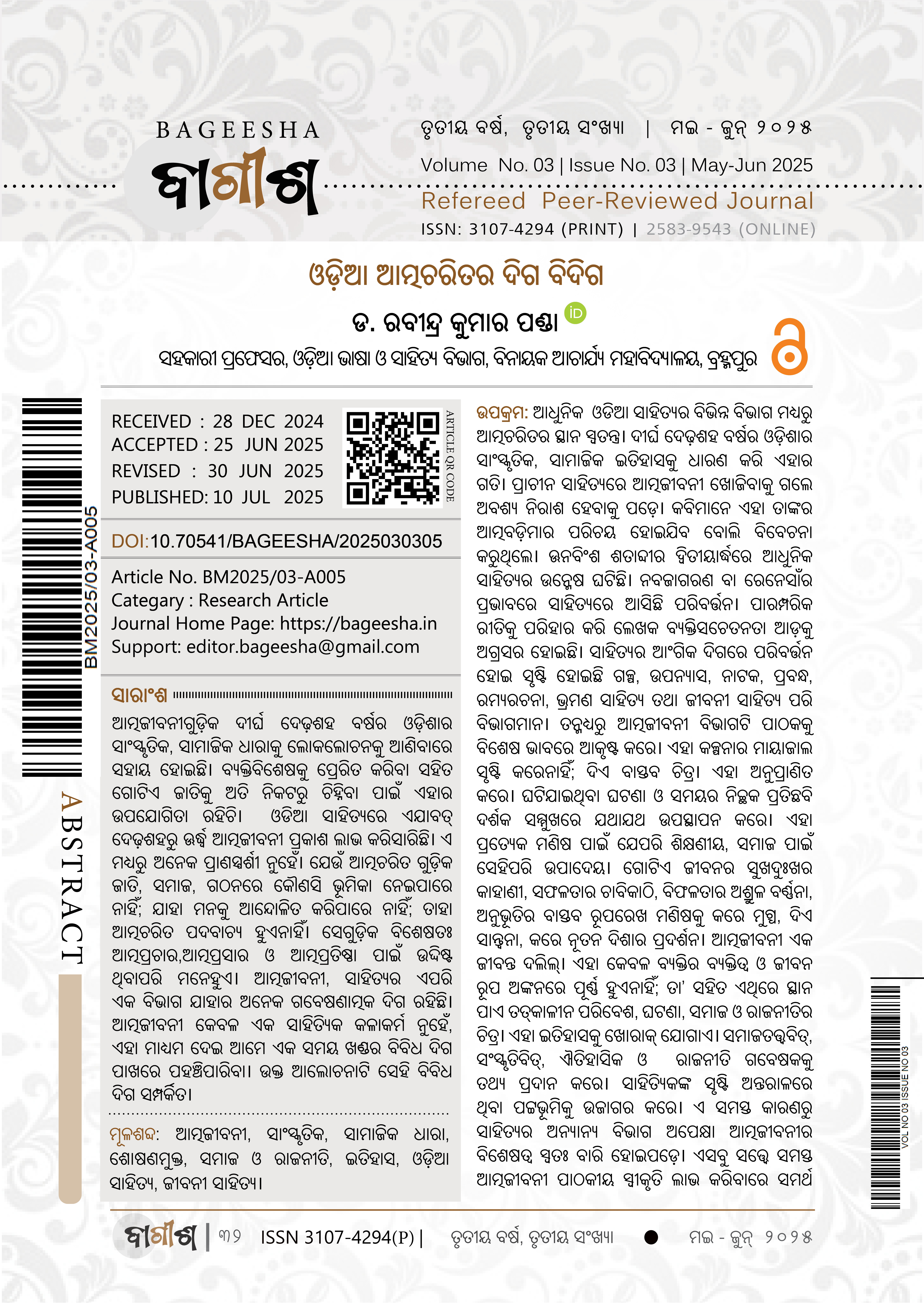 Panda, Rabindra Kumara, “Odia Atmacharitara Diga Bidiga”, Bageesha, Vol. No. 03, Issue No. 03, May-June 2025, Article No: BM2025/03-A005| Page- 32-38| DOI: https://doi.org/10.70541/BAGEESHA/2025030305
